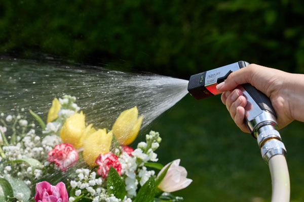 A szórófejen négy nyomáserősség és szórásminta közül tudunk választani: vízporlasztás, permetezés, esőszerű öntözés és erős nyomású öntözés. Növényeink vízigénye, a talaj tulajdonságai és vízvezető képessége határozza meg, hogy melyiket alkalmazzuk. Igény szerint tartós üzemre is állítható.